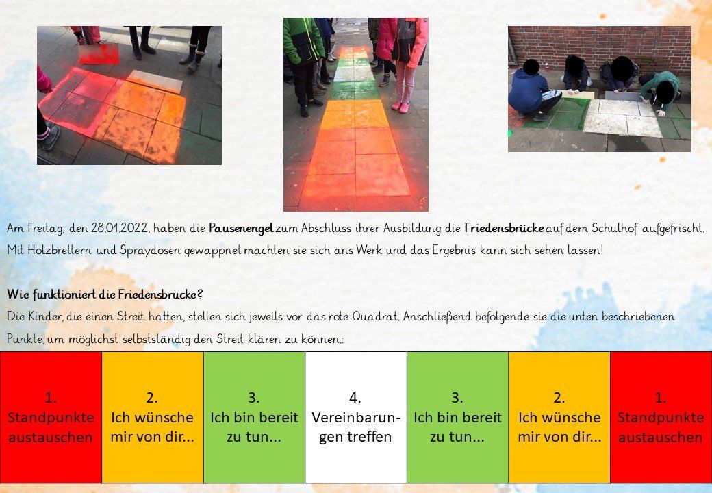 Die Kinder haben sich im Laufe von 8 Wochen zu Themen wie Streitschlichtung, gewaltfreie Kommunikation und Gewaltprävention fortgebildet. Nun dürfen sie zwei Mal wöchentlich die Lehrkräfte der Burgschule bei der Pausenaufsicht begleiten und unterstützen. Zu ihren Aufgaben gehören beispielsweise trösten, Schuhe binden, Jacken schließen, Streit schlichten, Streitpotenziale erkennen und frühzeitig unterbinden und Hilfe holen.