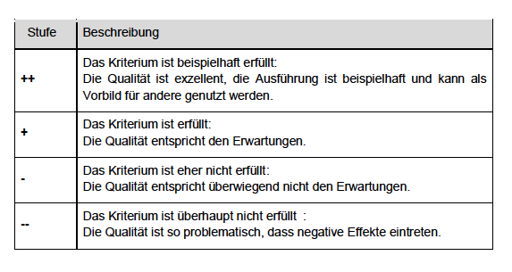 Auf der Ebene von Analysekriterien erfolgt die Bewertung in den vier in der folgenden Übersicht beschriebenen Stufen: